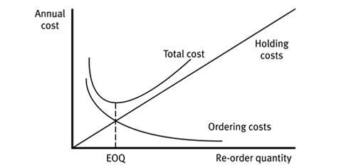 The assumptions here are that the cost of the item is fixed over a year, that the rate of demand is constant, that each batch is delivered at once and that the warehouse overheads vary proportionally to the amount of stock being held. We can graph these costs as a function of the batch, or re-order quantity, and add them together to show the total cost wth respect to quantity: